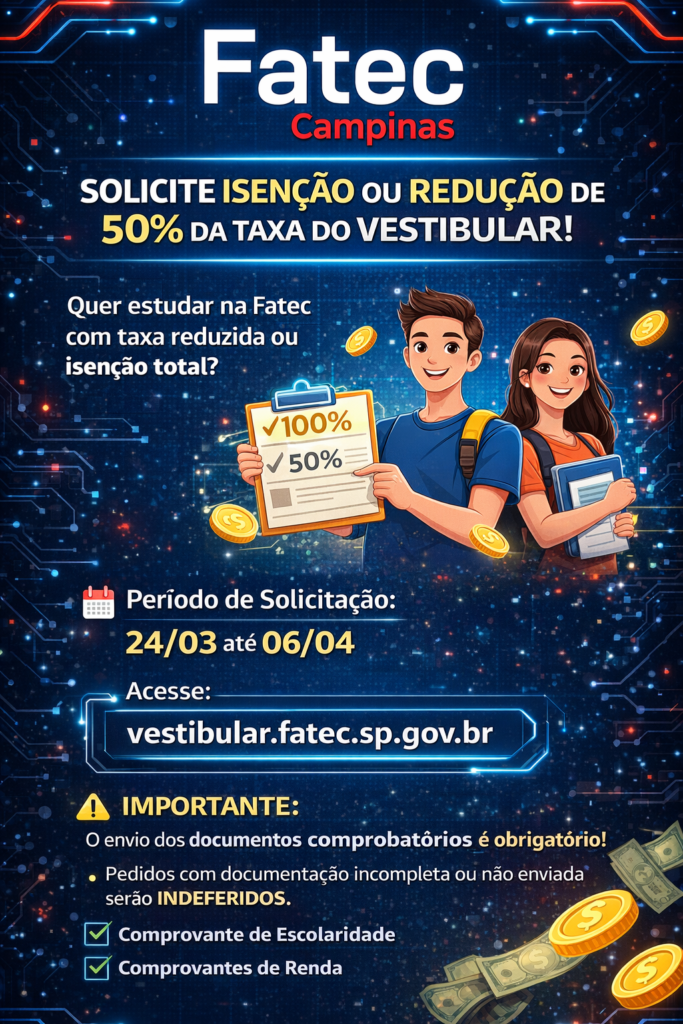A Fatec Campinas informa que está aberto o período para solicitação de isenção total ou redução de 50% da taxa de inscrição do Processo Seletivo Vestibular para o 2º semestre de 2026. O pedido deve ser realizado online, com envio obrigatório da documentação comprobatória.